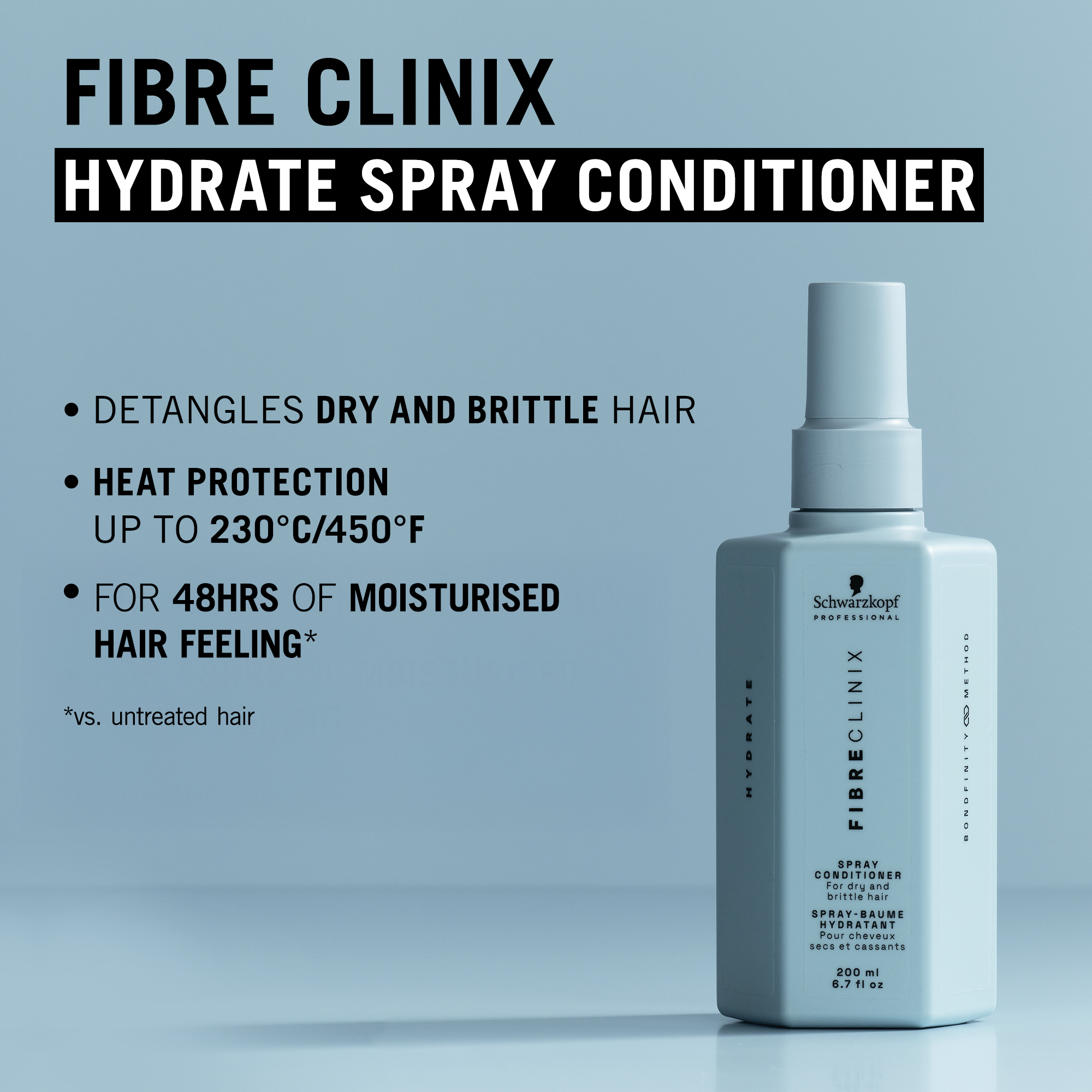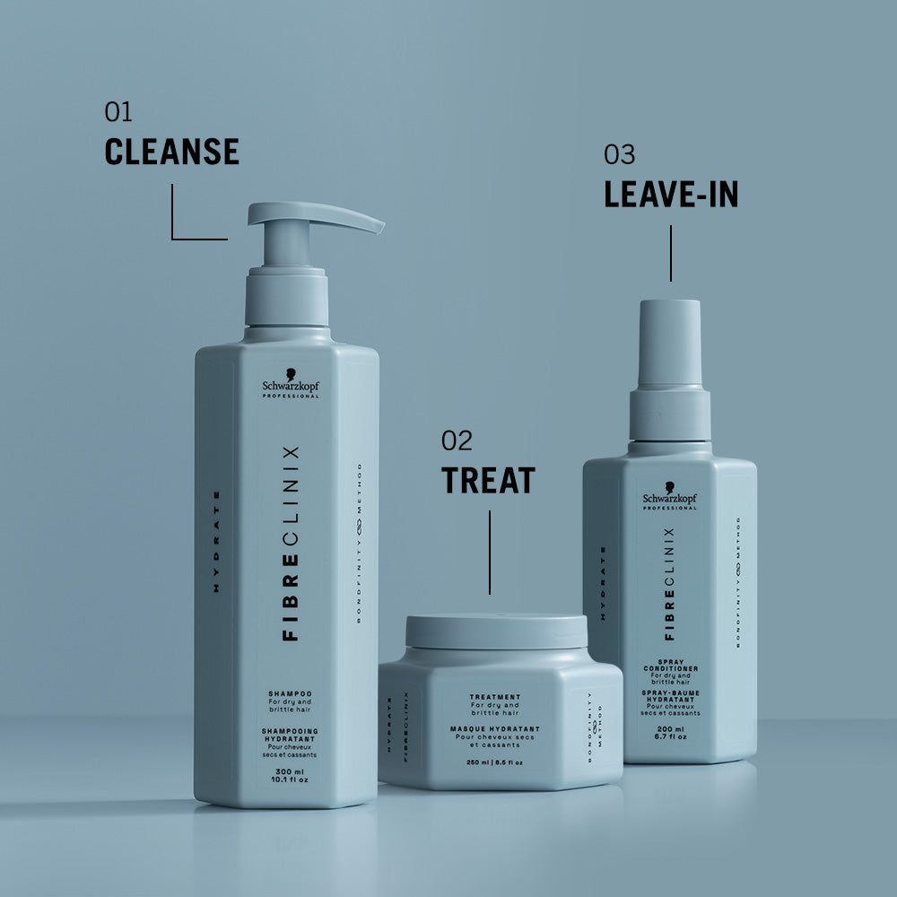Schwarzkopf Fibre Clinix Hydrate Leave-In Spray is a lightweight, hydrating leave-in treatment for dry, brittle, and moisture depleted hair that instantly refreshes and softens strands.